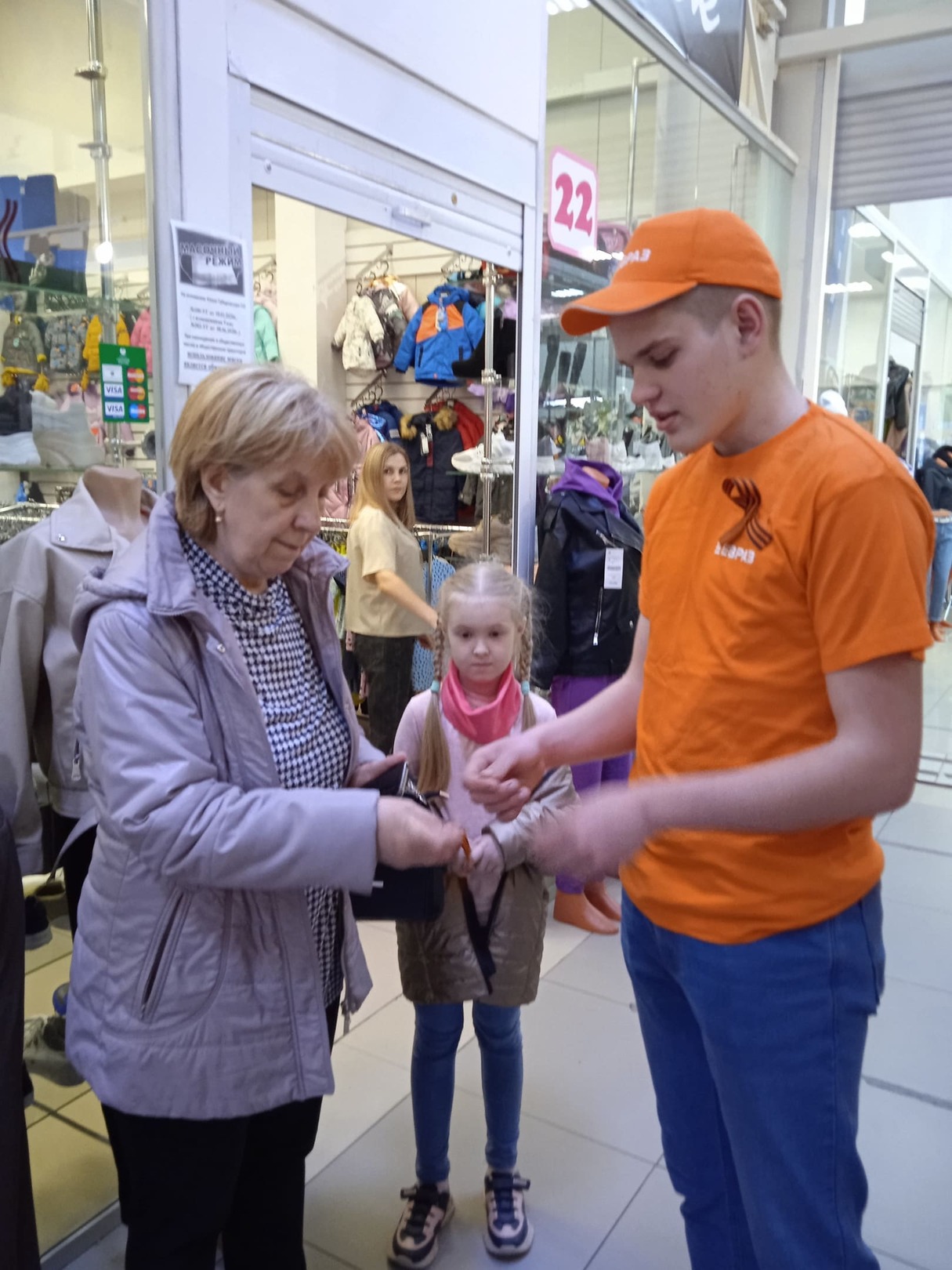 Ребята раздавали «Георгиевские ленточки» и памятки о них посетителям торгового центра «Восток» 27 апреля. Всего было роздано 100 ленточек. Волонтеры рассказали о глубоком символическом значении цветов. Цвет пороха или дыма и цвет огня – это цвета Победы, цвета мужества и героизма. Также ребята рассказывали о том, что лучшее место для георгиевской ленточки – на груди в районе сердца. Закрепить её можно в виде банта или петельки.