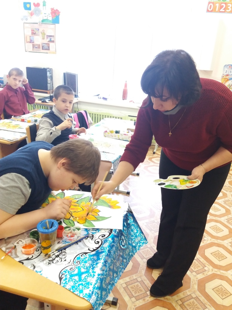 Жирафы и подсолнухи, закаты, дельфины – чего только не придумали для особенных детей художники-педагоги: Татьяна Пермякова, Анна Яковлева, Марина Попова, Юлия Пислегина, Татьяна Шабалина, Людмила Брагина! Разве есть лучшая награда для учителя, чем счастливые глаза детей, удивленных своими работами: «У меня получилось»!